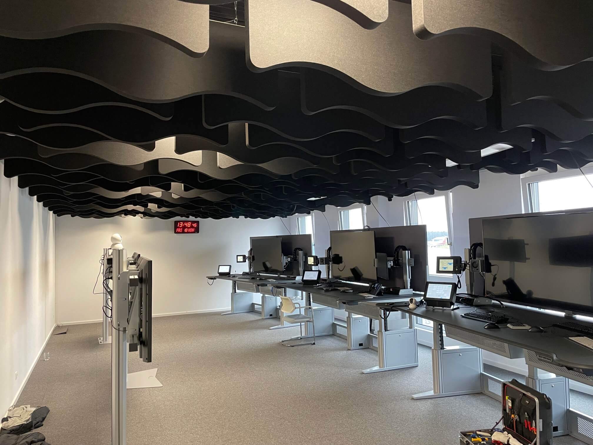 Maßgefertigte Deckensegel zur Schalloptimierung im Arbeitsumfeld für Fluglotsen.