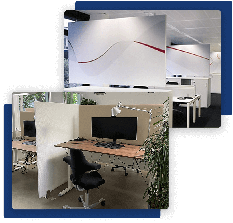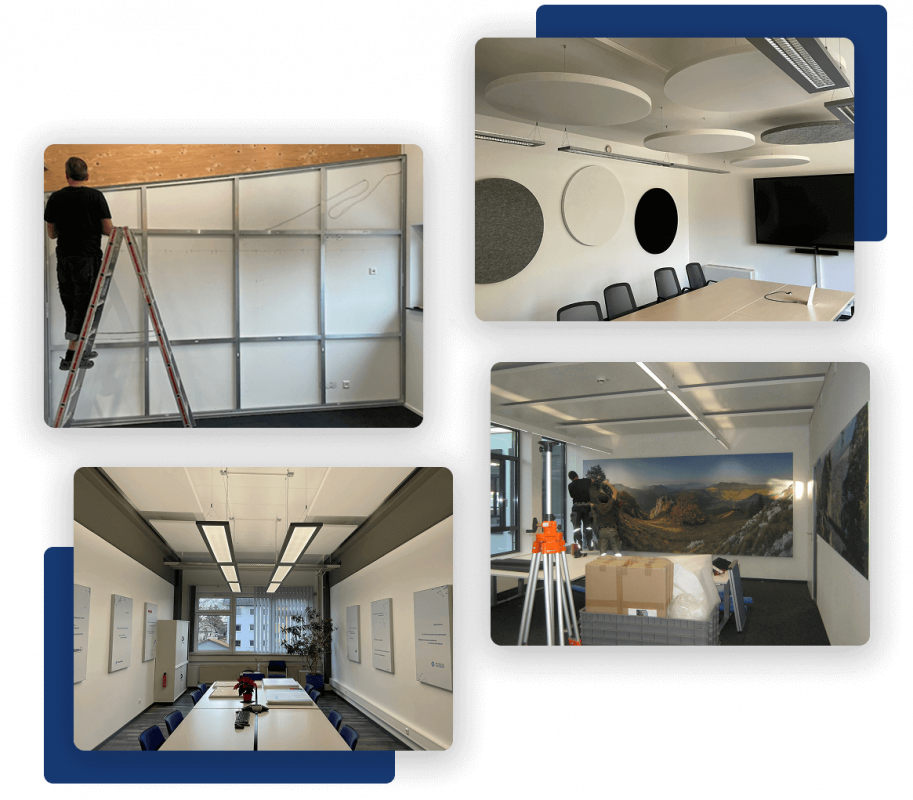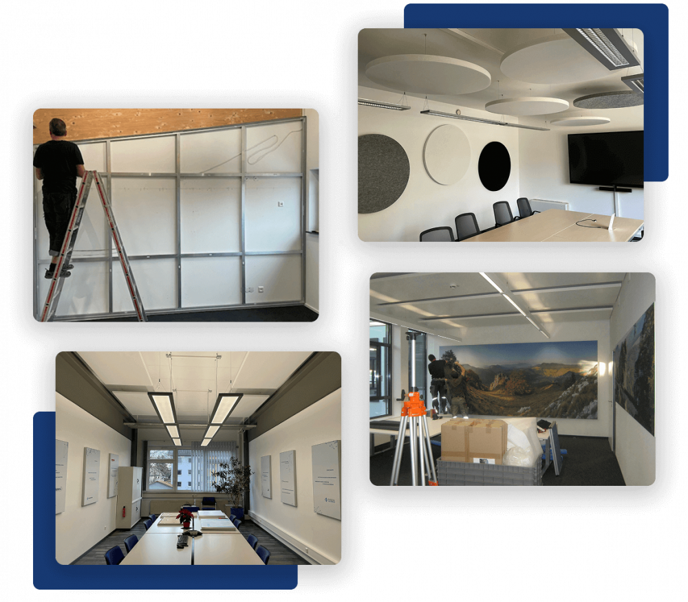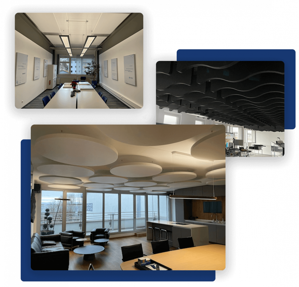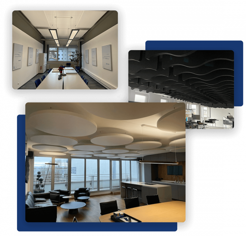 Unser Ziel ist es, die Ästhetik Ihrer Räumlichkeiten mit der Funktionalität der Akustiklösungen zu verbinden. Durch die Optimierung wird Lärm zuverlässig reduziert, Ihre Mitarbeiter fühlen sich wohler und arbeiten produktiver.